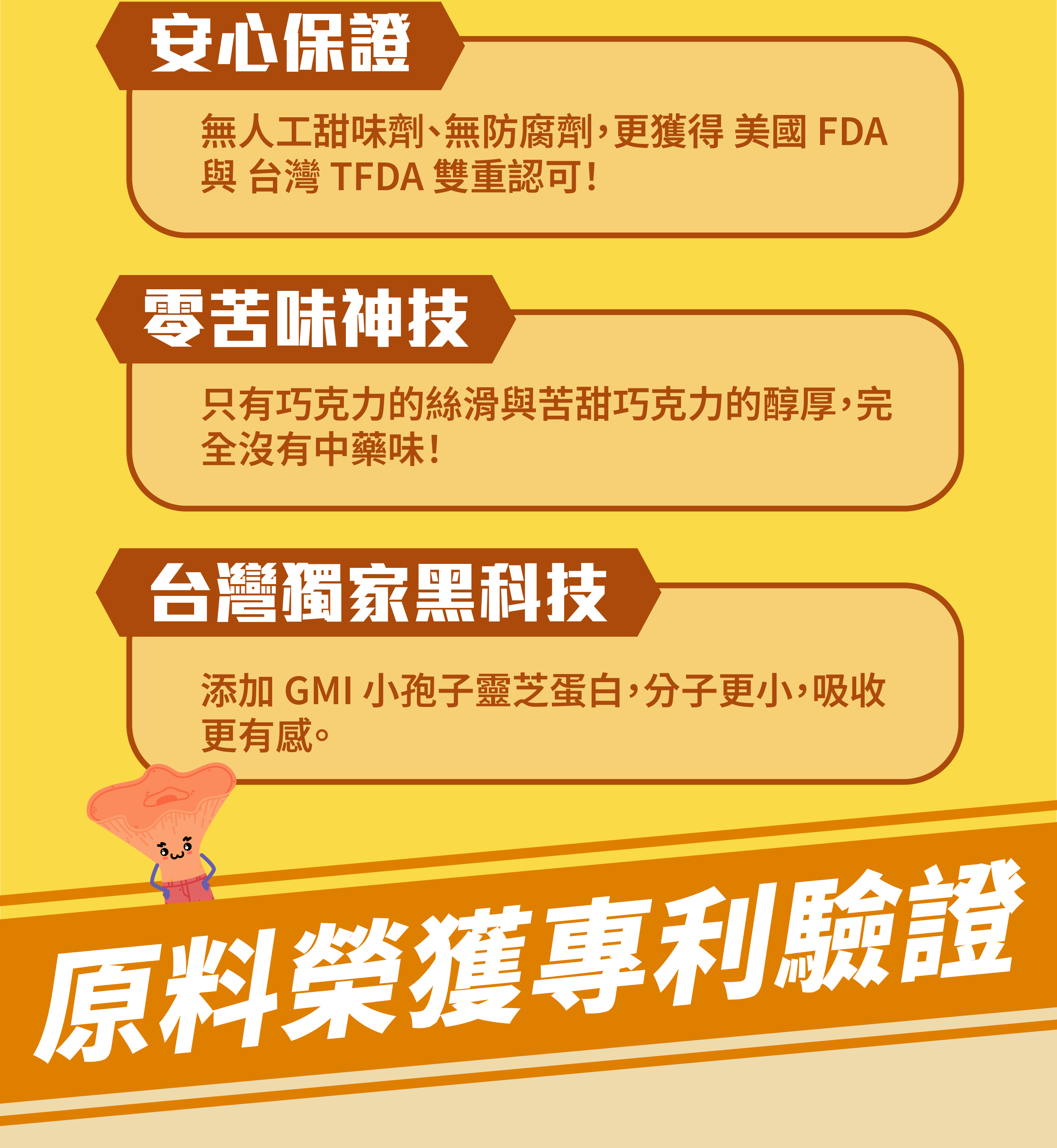 【內容物成份】砂糖、麥芽糖、椰子油、明膠、可可粉、GMI靈芝濃縮萃取物(靈芝子實體萃取物[靈芝子實體(Ganoderma lucidum, 太空包培養)、玉米澱粉]、GMI蛋白粉[麥芽糊精、小孢子靈芝類球蛋白濃縮液液]、玉米澱粉)、海鹽、焦糖色素、香料、棕櫚蠟(食品製造用劑)。
