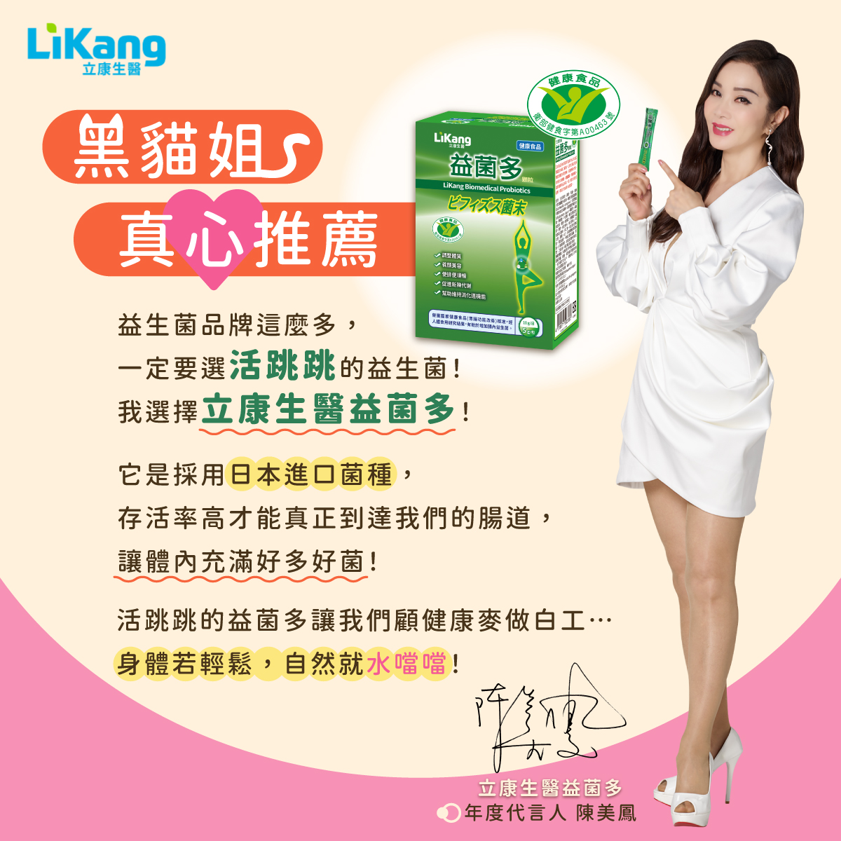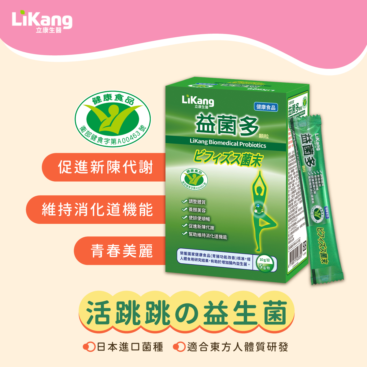 嚴選日本進口菌種,立康生醫益菌多顆粒能幫助排便順暢、促進新陳代謝、維持消化道機能、調整體質、青春美麗。